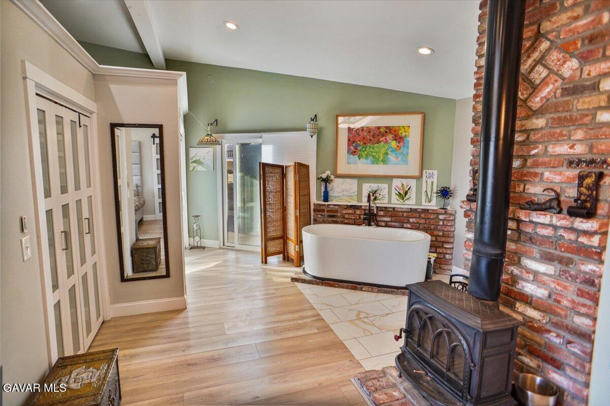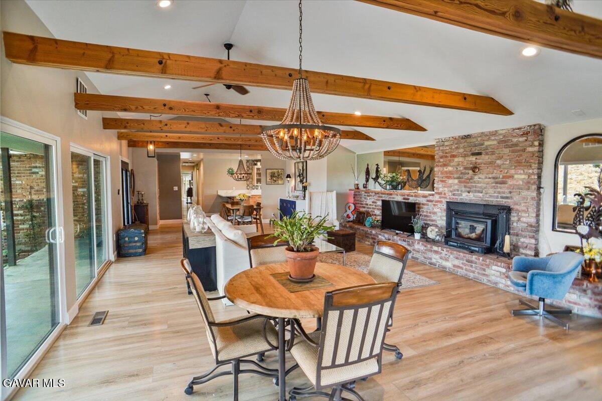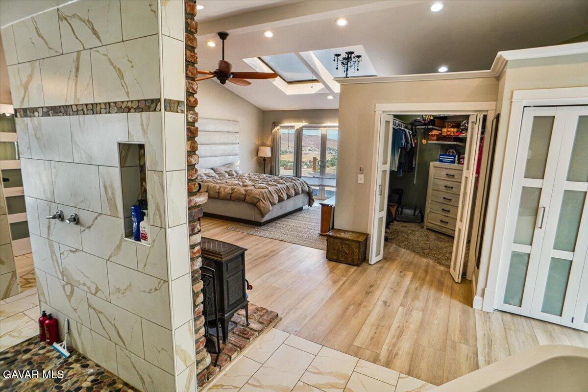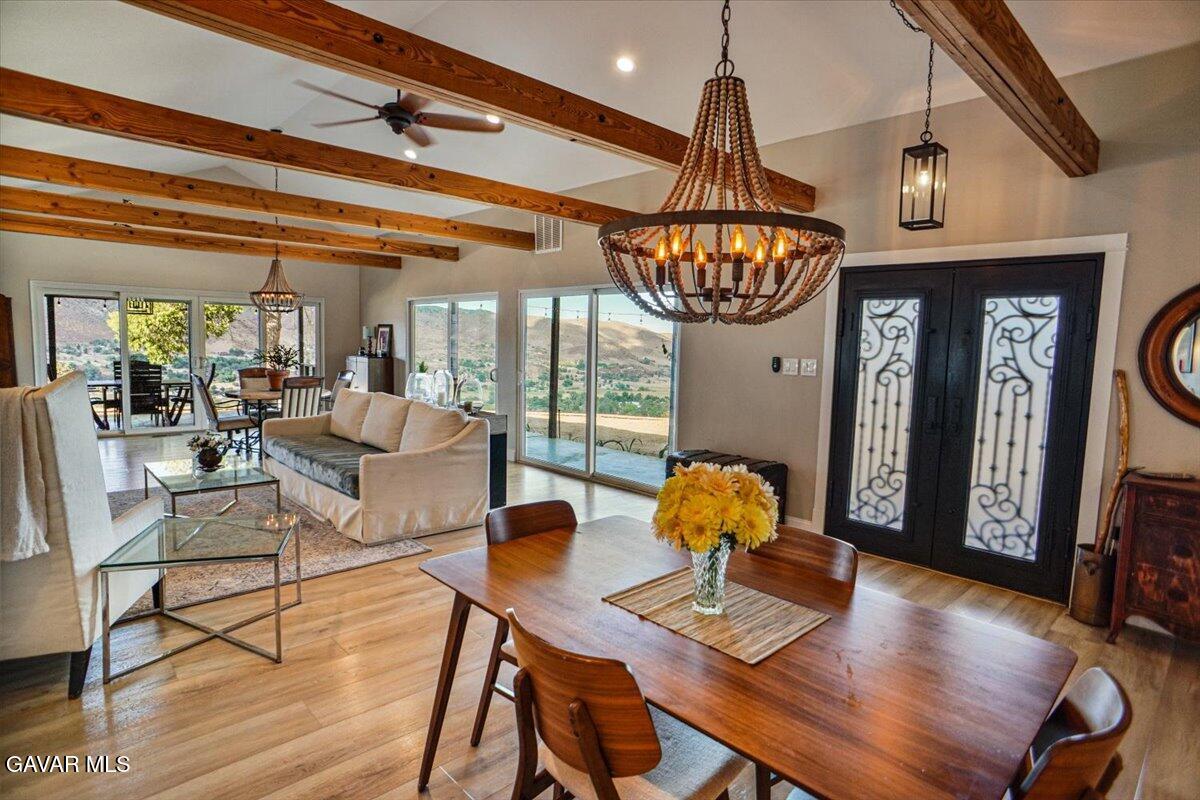 Enjoy breathtaking, unobstructed views from this beautifully remodeled 4-bedroom, 3-bath home set on 2.48 private acres in the serene community of Leona Valley. Just 10 minutes from Palmdale and the 14 Freeway, this retreat combines modern upgrades with warm, inviting character -- including a brand new roof.Inside, the open-concept great room showcases a brick fireplace spanning the full wall, open-beam ceilings, new wood-look flooring, and expansive windows that frame the valley views. A set of sliding glass doors leads out to the covered patio and BBQ area--perfect for entertaining or simply relaxing.The chef's kitchen features new Craftsman-style cabinetry, rich quartz countertops, a stainless steel farm sink, and high-end stainless steel appliances, including a designer hood.The luxurious primary suite feels like a boutique hotel, offering a spacious walk-in closet with frosted glass barn-style doors, skylights, a freestanding soaking tub, a stone-floor walk-through shower, and a cozy woodstove for cool evenings.Additional highlights include three spacious secondary bedrooms, two stylishly remodeled baths, a barn for animals or projects, and an extra storage shed.Private yet accessible, this move-in ready home is a rare opportunity to own your piece of paradise in Leona Valley.