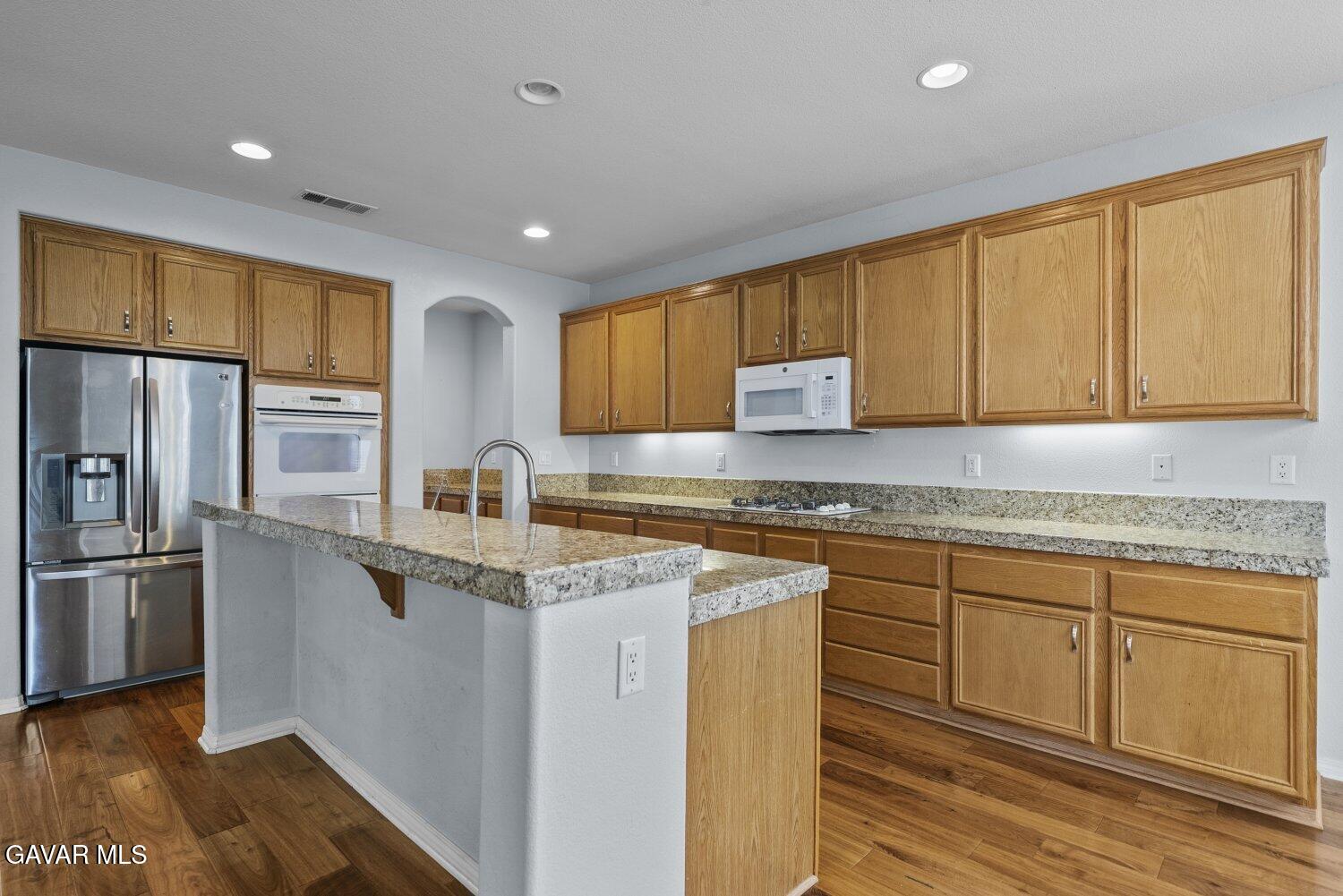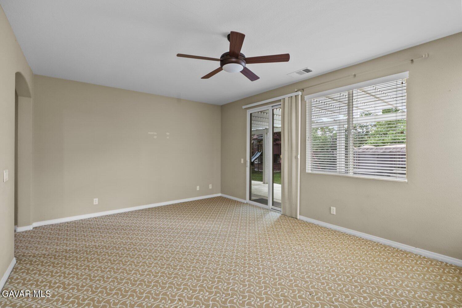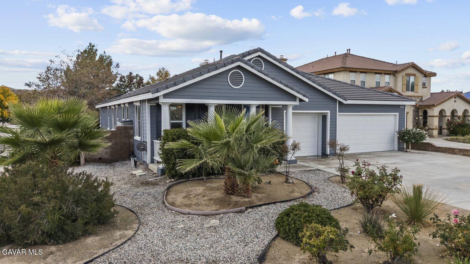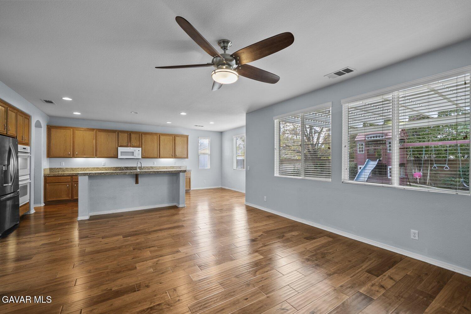Welcome to this spacious and beautifully maintained 3-bedroom, 3-bath home featuring an additional room perfect for a home office, guest space, or playroom. Offering 2,684 sq. ft. of comfortable living space on an 8,457 sq. ft. lot, this home is filled with desirable upgrades including hardwood floors, high ceilings, recessed lighting, and ceiling fans throughout.The open-concept kitchen boasts granite countertops, stainless steel appliances, a double oven, and plenty of cabinet space, ideal for everyday cooking and entertaining. Enjoy cozy evenings in the inviting living room complete with a fireplace. The primary suite features a walk-in closet, a relaxing soaking tub, and a separate shower for added luxury. Solar panels (leased) provide energy efficiency and cost savings.Outside, the property offers both a front and backyard, including a covered patio, green lawn, and a cemented area perfect for outdoor furniture and gatherings. The attached 3-car garage provides plenty of parking and storage space. This home truly has it all, comfort, style, and functionality.