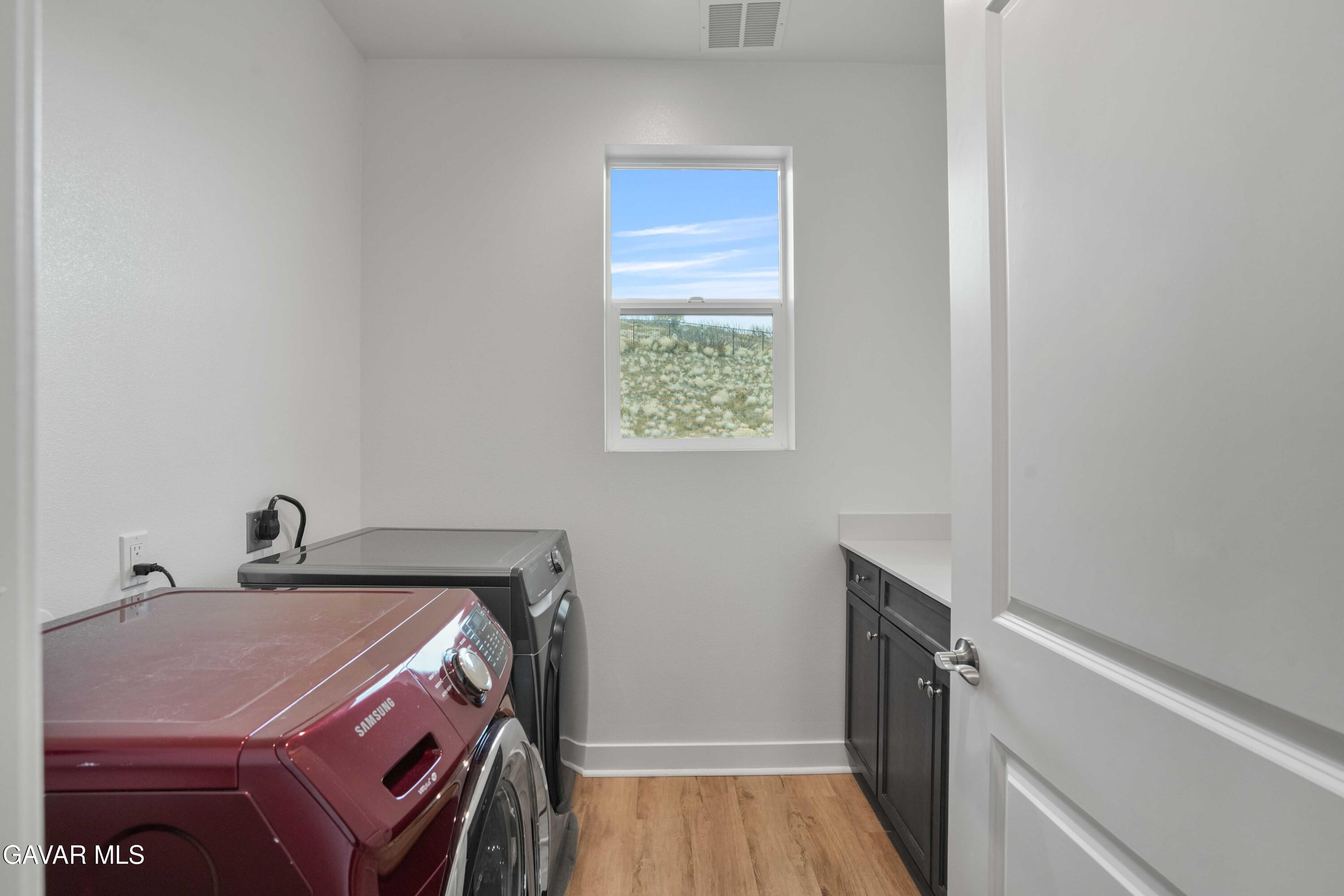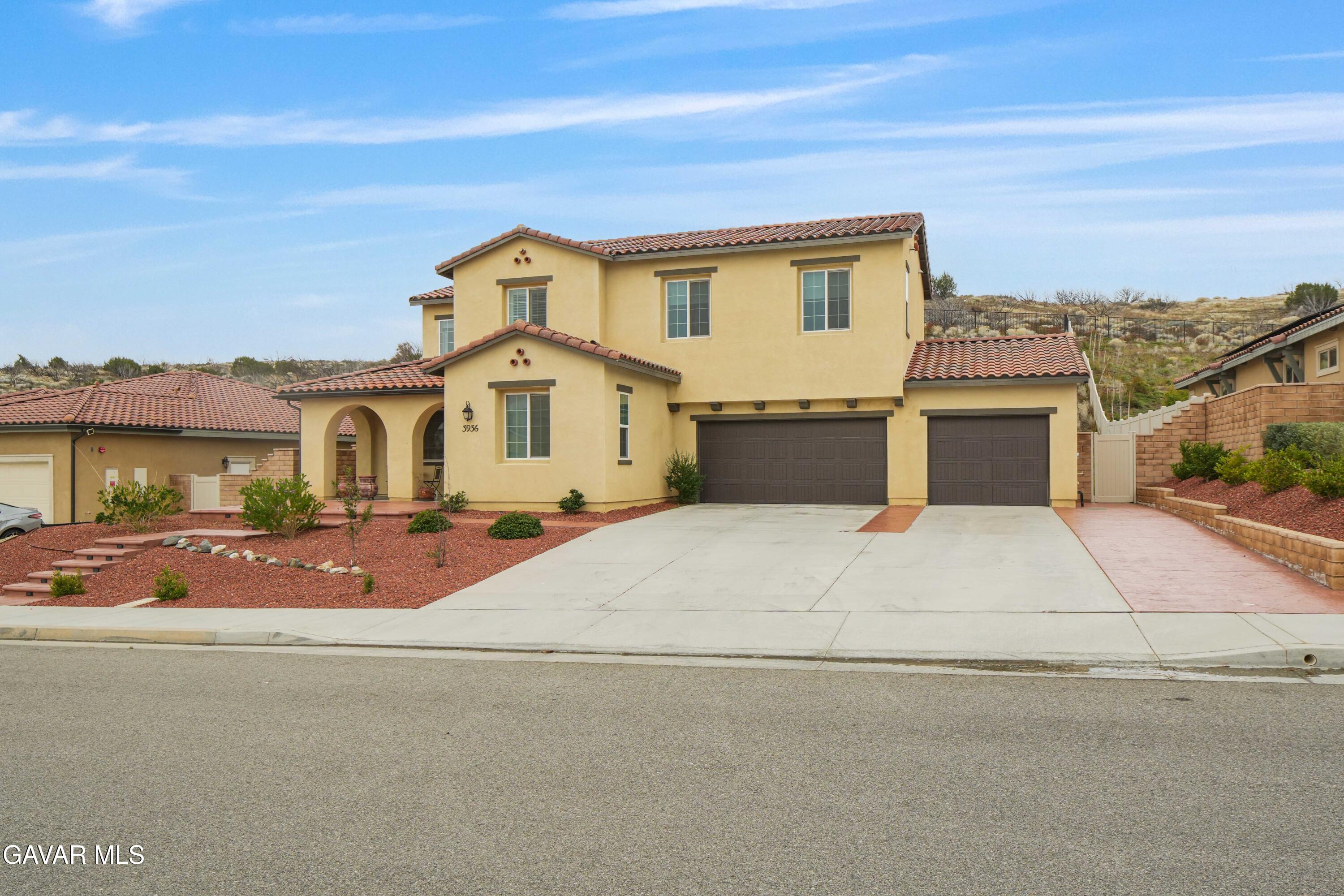 ASSUMABLE FHA LOAN RATE AT 2.99% LOAN BALANCE APPROX $525K!!! Luxury West Palmdale Home For Sale in the newest gated community of Saddlewood Joshua Ranch constructed in 2020. No need to spend extra money compared to buying new from the builder take advantage of this home fully completed exterior landscaping. Featuring one of the largest models, the Plan 3 Elevation A with 3,186 sq.ft. 18 Solar Panels OWNED (not leased and no monthly payments) plus electric vehicle EV ready outlet in the garage. Other features include Quartz countertops, Luxury Vinyl Planks, and a Whole House Fan. The Downstairs includes 1 bedroom and 1 full bathroom, in addition to a powder or half bathroom downstairs for visitors. Open concept Kitchen to Dining area to Family room, you'll be able to entertain all your guests in one large area without missing a beat. Adjacent to the Kitchen is a dry bar or butlers bar, and a walk-in Pantry, and ending with the Formal Living room facing the front of the house which creates the perfect room for decorating the tree for the Holidays! Upstairs includes 2 guest bedrooms, 1 full bathroom for the guest bedrooms, and a Loft that is conveniently adjacent to the guest bedrooms which creates the perfect upstairs Living or entertainment room. The Primary Suite upstairs is spacious to include a King set, office space, a walk-in closet, a walk-in shower, a soaking tub, a private toilet room, and a dual-sink vanity. With no rear neighbor, the Primary bedroom has gorgeous views of the backyard. Conveniently located upstairs is a Laundry Room with cabinetry and rough plumbing ready for a future sink. The 3 car garage side-by-side is wide and long and high ceilings ready for installing additional storage racks. The driveway can potentially fit another 6 vehicles depending on size, you might be able to park up to 9 vehicles parked within your property line (buyer to verify). The HVAC includes 2 AC condensers, one for downstairs and one for upstairs.