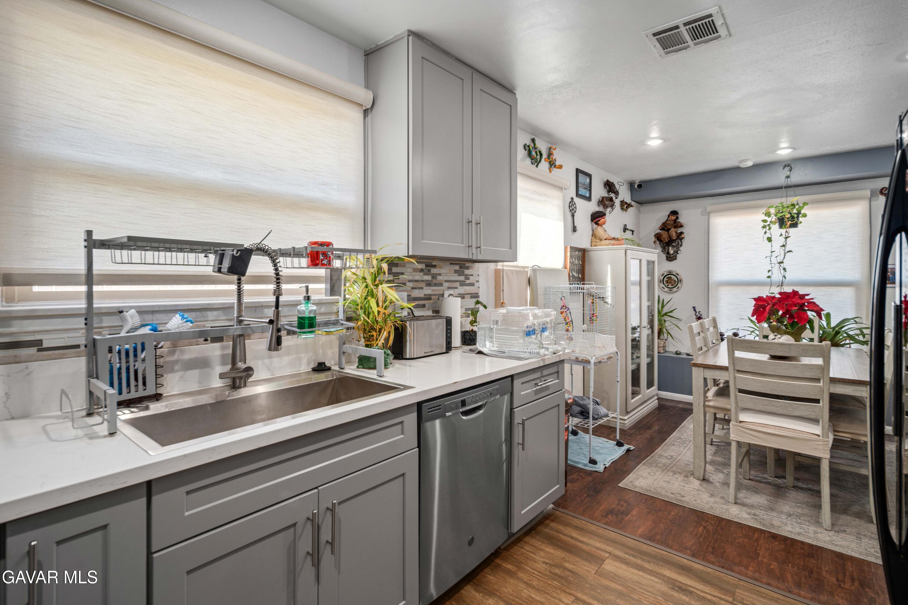 Welcome home to this beautifully renovated, move-in-ready 3-bedroom, 2-bath West Lancaster residence. This thoughtfully updated home offers a functional floor plan with stylish finishes throughout. Upon entry, a charming dining nook with a window seat flows seamlessly into the updated kitchen, which features wood-look tile flooring, quartz countertops, a mosaic tile backsplash, soft-close cabinetry, upgraded cabinet hardware, and refaced bedroom doors.The spacious living room opens to the left and is enhanced by recessed lighting, newer interior paint, updated electrical outlets, and a newer HVAC system for year-round comfort, and 2 swamp coolers. Both bathrooms have been tastefully upgraded, and the indoor laundry room includes added cabinetry and upgraded doors for extra storage and convenience.Additional improvements include a new garage door, new window shades, and an enclosed bonus room off the garage with a separate exterior entrance--ideal for a home office, gym, or flex space (buyer to verify permits and use).The backyard offers a grassy area with mature cherry and apricot trees, plenty of room for entertaining, play, or a future pool, and is complemented by drip irrigation in both the front and rear yards.Conveniently located near schools, shopping, dining, and with easy access to the 14 Freeway, this home checks all the boxes for comfort, upgrades, and location. A must-see West Lancaster opportunity.