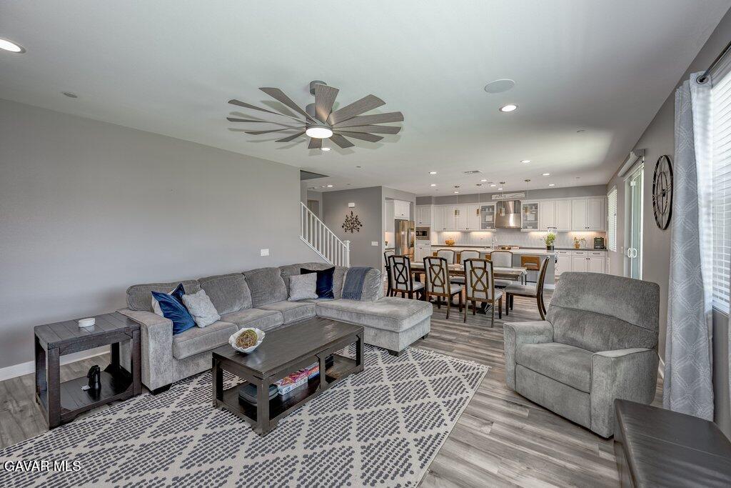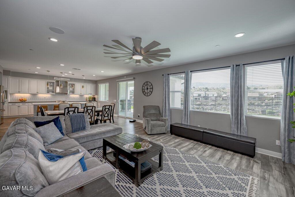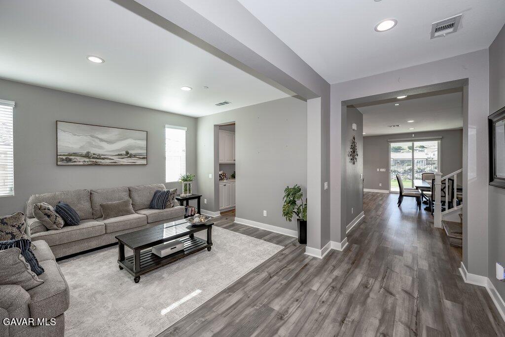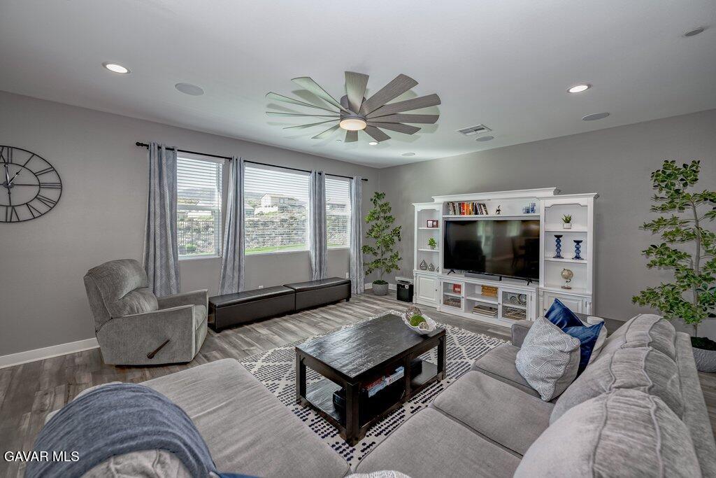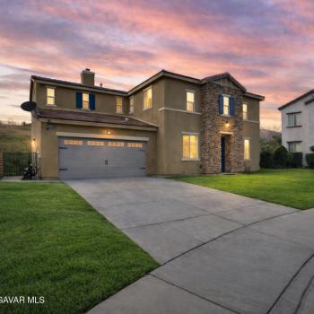Welcome to this upgraded and energy efficient 2 story West Palmdale view home. This home features a 3 car pull through garage, OWNED solar, downstairs bedroom with private bath, and an open and expansive floorplan. From the entry, the formal living room, wide open kitchen with giant island and great views, large family room, downstairs bedroom with private bath plus a powder room, the first level is loaded with features. There's a great indoor/outdoor living area with fireplace, butler's pantry, and mudroom. The 3 car pull through garage is a great way to get bikes, cars, motorcycles or whatever you have into the back yard for detailing and/or storage. On the second level, there is a great currently used as an office/study area, and a gorgeous primary suite with a massive spa like bathroom, separate tub and shower, and roomy walk in closet. With 2 additional bedrooms upstairs plus the laundry room, you will have plenty of space for everyone. This home is just 5 years old, with recessed lighting, ceiling fans, and modern energy efficiency. Fully landscaped front and rear, there's also putting green to hone your skills in private. Located minutes from Highland High School, Palmdale Medical, Marie Kerr Park, Trader Joe's and so much more. You don't even need to leave the neighborhood to access the great hiking and mountain biking trails that are right here! You're going to love everything this home has to offer.