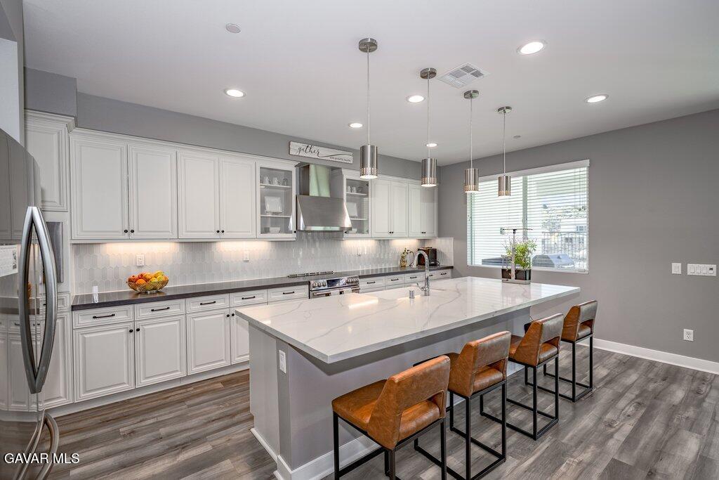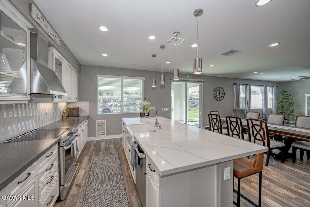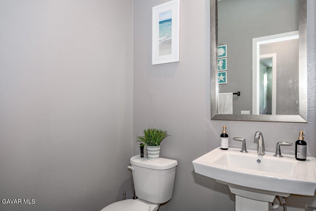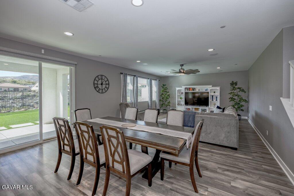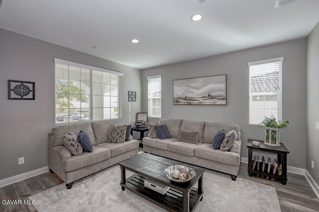 Welcome to this upgraded and energy efficient 2 story West Palmdale view home. This home features a 3 car pull through garage, OWNED solar, downstairs bedroom with private bath, and an open and expansive floorplan. From the entry, the formal living room, wide open kitchen with giant island and great views, large family room, downstairs bedroom with private bath plus a powder room, the first level is loaded with features. There's a great indoor/outdoor living area with fireplace, butler's pantry, and mudroom. The 3 car pull through garage is a great way to get bikes, cars, motorcycles or whatever you have into the back yard for detailing and/or storage. On the second level, there is a great currently used as an office/study area, and a gorgeous primary suite with a massive spa like bathroom, separate tub and shower, and roomy walk in closet. With 2 additional bedrooms upstairs plus the laundry room, you will have plenty of space for everyone. This home is just 5 years old, with recessed lighting, ceiling fans, and modern energy efficiency. Fully landscaped front and rear, there's also putting green to hone your skills in private. Located minutes from Highland High School, Palmdale Medical, Marie Kerr Park, Trader Joe's and so much more. You don't even need to leave the neighborhood to access the great hiking and mountain biking trails that are right here! You're going to love everything this home has to offer.